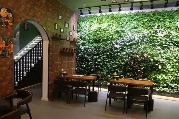 浪漫風(fēng)的設計裝飾風(fēng)格,明亮的綠色為主,清新氣息撲面而來(lái);滿(mǎn)眼的綠色花墻,仿佛置身于雨林中。