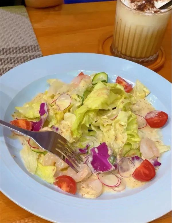 蝦仁時(shí)蔬沙拉,用料相當良心!鮮甜的蝦仁、生菜、培根片、小番茄...每一口層次感都非常豐富!