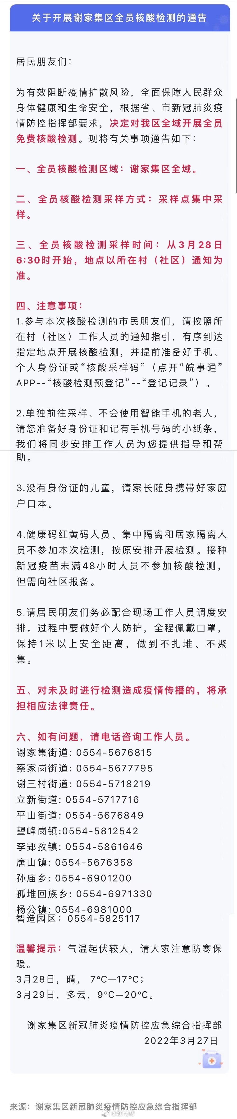 淮南關(guān)于開(kāi)展謝家集區全員核酸檢測的通告