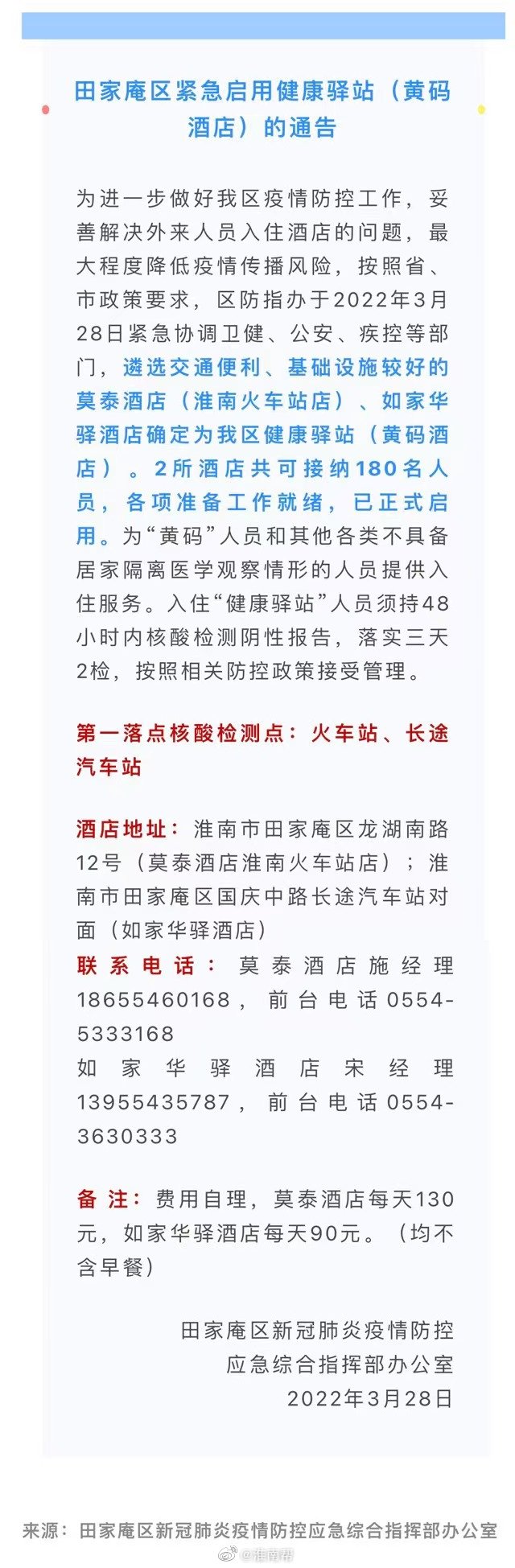 淮南市田家庵區緊急啟用健康驛站(黃碼酒店)的通告