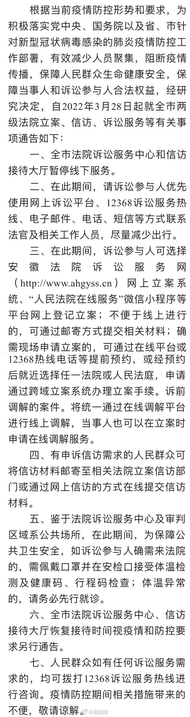 自2022年3月28日起就淮南市兩級法院立案、信訪(fǎng)、訴訟服務(wù)等有關(guān)事項通告如下。