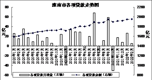 2022年2月末,全市金融機構人民幣各項貸款余額為1954.9億元,位于全省第12位;比上月增加5.3億元,增長(cháng)0.3%,同比少增24.2億元;比年初增加31.7億元,增長(cháng)1.6%,同比少增32.1億元。從增量來(lái)看,淮南市各項貸款較年初新增量全省排名第13位;從增速來(lái)看,淮南市各項貸款較年初增速全省排名第14位。