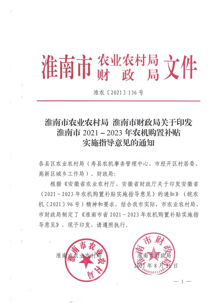 淮南市農業(yè)農村局淮南市財政局關(guān)于印發(fā)淮南市2021-2023年農機購置補貼實(shí)施指導意見(jiàn)的通知