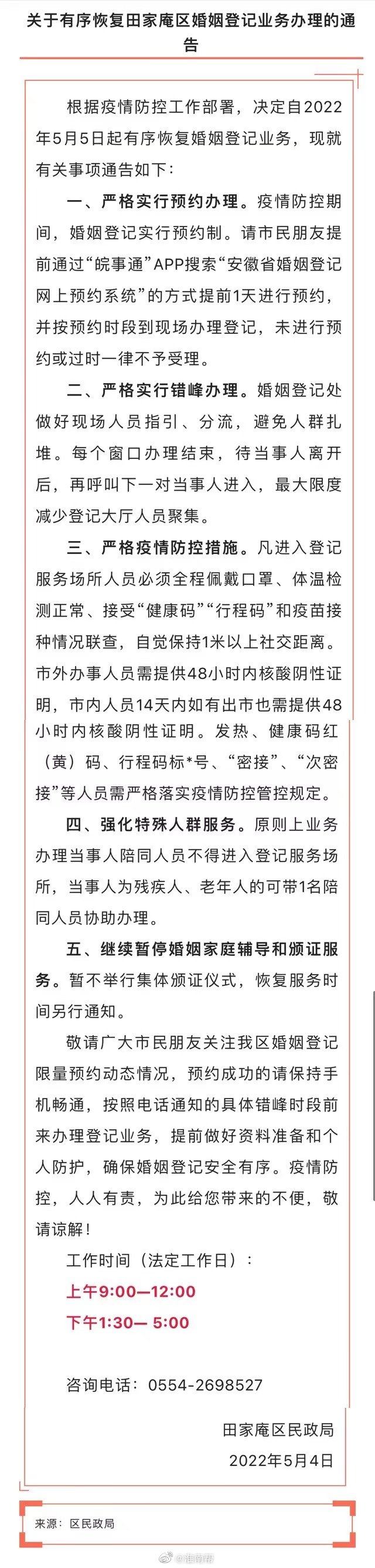 根據疫情防控工作部署,決定自2022年5月5日起淮南有序恢復婚姻登記業(yè)務(wù),現就有關(guān)事項通告如下