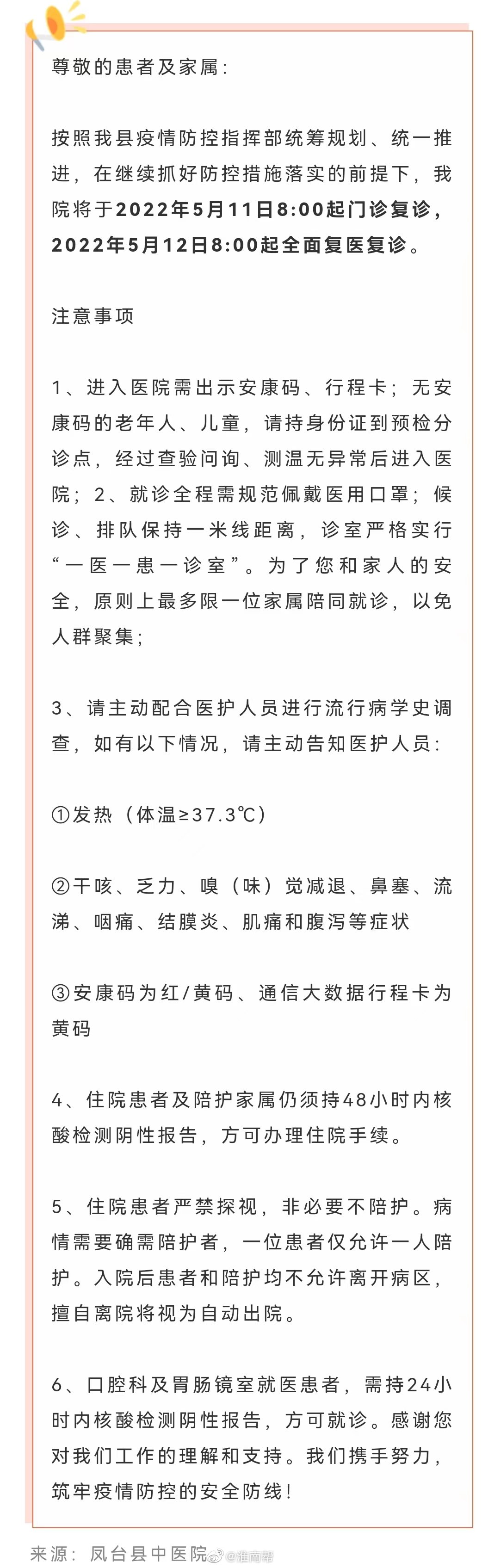 按照淮南市鳳臺縣疫情防控指揮部統籌規劃、統一推進(jìn),在繼續抓好防控措施落實(shí)的前提下,鳳臺縣中醫院將于2022年5月11日8:00起門(mén)診復診,2022年5月12日8:00起全面復醫復診。