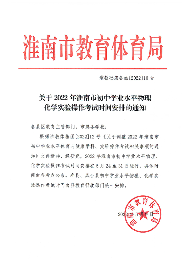 淮南市關(guān)于2022年初中學(xué)業(yè)水平物理化學(xué)實(shí)驗操作考試時(shí)間安排的通知