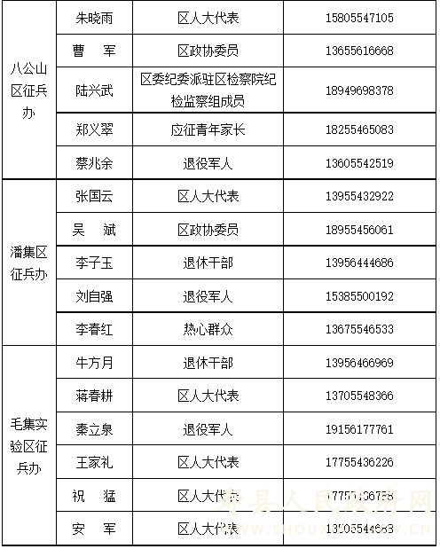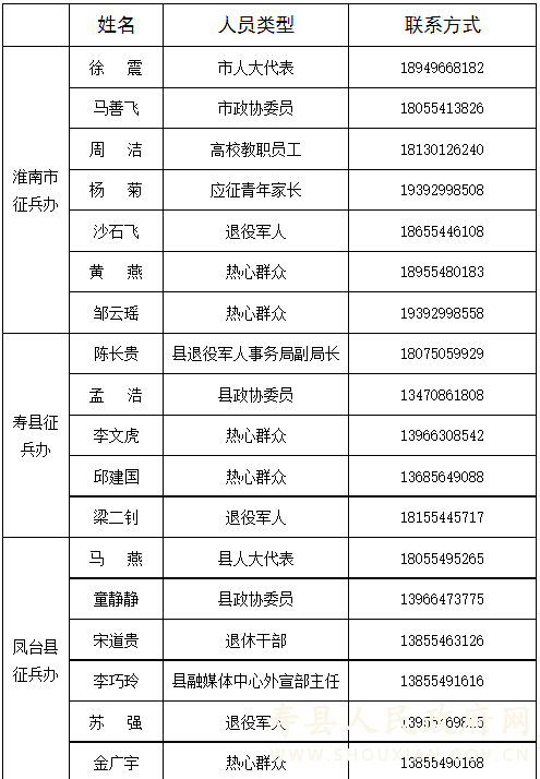 廉潔征兵監督員和監督舉報電話(huà)公布為嚴明兵員征集紀律規定,筑牢廉潔征兵底線(xiàn),增強征兵工作透明度,自覺(jué)接受人民群眾監督,保證全市征兵工作公開(kāi)、公平、公正,現將淮南市2023年市縣兩級人民政府征兵辦公室廉潔征兵監督員及監督舉報電話(huà)予以公布,歡迎社會(huì )各界對征兵工作進(jìn)行監督?!疽?jiàn)表格】淮南市廉潔征兵監督員名單淮南市廉潔征兵監督舉報聯(lián)系方式