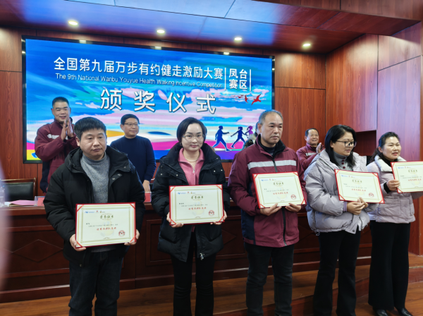 12月31日下午,淮南市鳳臺縣賽區頒獎儀式在鳳臺縣疾控中心六樓會(huì )議室隆重舉行,中心黨總支書(shū)記、主任王洪麗同志,中心黨總支委員、副主任李勇同志到會(huì )祝賀并參加頒獎。中心黨總支書(shū)記、主任王洪麗同志,中心黨總支委員、副主任李勇同志等32名同志榮獲“萬(wàn)步達人獎”、中心張飛同志榮獲“優(yōu)秀隊長(cháng)獎”、李多艷同志榮獲“萬(wàn)步先鋒獎”、陳玉虹同志榮獲“減重達人獎”。李勇副主任在頒獎發(fā)言中希望大家能通過(guò)參賽養成在日常生活中健走的良好習慣,做自己健康的第一責任人。再接再厲,爭取明年再創(chuàng )佳績(jì)!希望明年有更多的人員參加到國家“萬(wàn)步有約”健走激勵大賽中來(lái)!