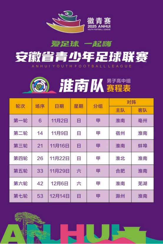 賽事預告 | 淮南VS亳州!11月2日,徽青賽激戰將至,主場(chǎng)烽火為你點(diǎn)燃!【主場(chǎng)戰鼓擂響!淮南青少年亮劍徽青賽!】安徽青少年足球聯(lián)賽(徽青賽)男子高中組甲組淮南賽區的首輪對決即將拉開(kāi)戰幕!淮南隊坐鎮主場(chǎng),迎戰亳州隊,兩隊首度交鋒,綠茵場(chǎng)上必將精彩紛呈!本屆徽青賽第一階段比賽,淮南隊將經(jīng)歷7場(chǎng)激烈比拼,其中3場(chǎng)關(guān)鍵主場(chǎng)戰役的勝負,將直接影響最終比賽成績(jì)。誠邀全市球迷到場(chǎng),為家鄉球隊吶喊助威!這片綠茵