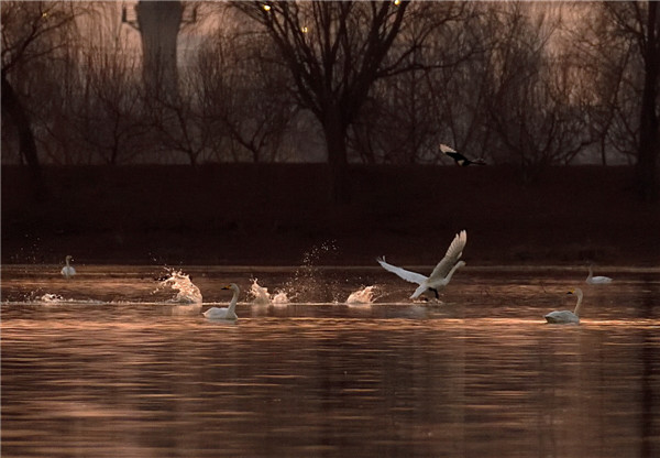 當泛紅的夕陽(yáng)懸掛在池塘對面上空,被映紅了的水面波光粼粼,隨風(fēng)蕩漾。落日前的天鵝,一改白晝時(shí)的懶散,或休閑游弋在水面,或煽動(dòng)它迷人的翅膀,顯得格外美麗動(dòng)人,仿佛是天使來(lái)到我面前,使我怦然心動(dòng),讓我的心撞擊著(zhù)相機快門(mén)咔嚓咔嚓地響個(gè)不停。 攝影: